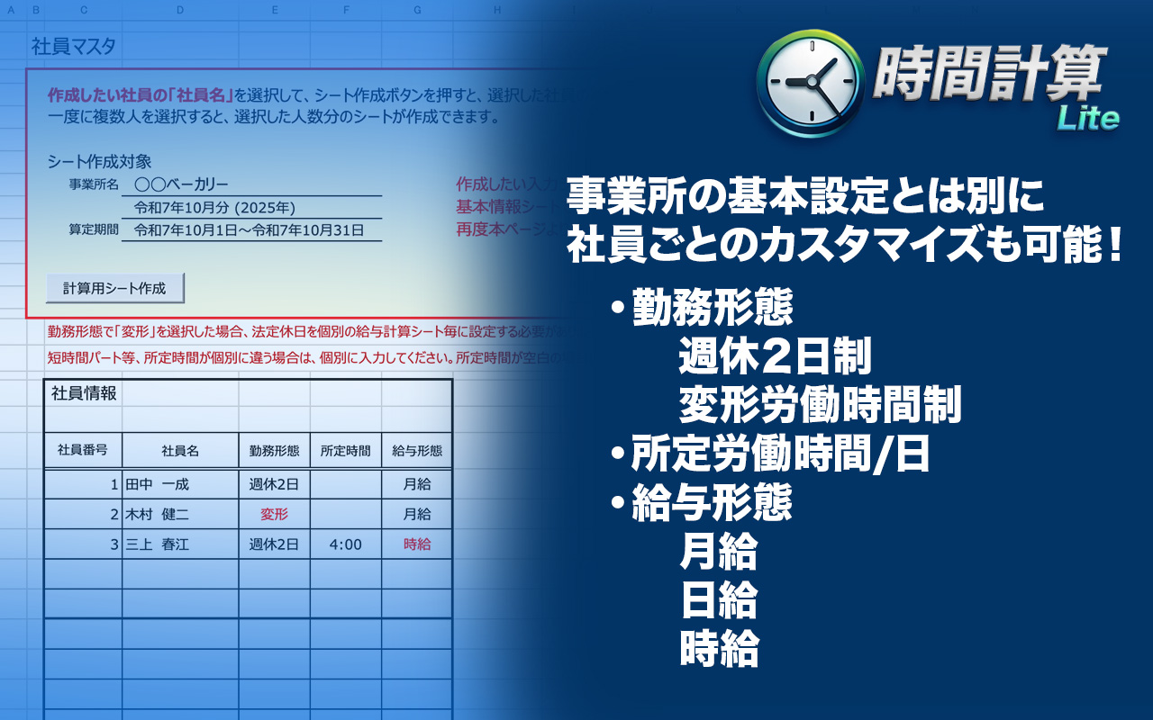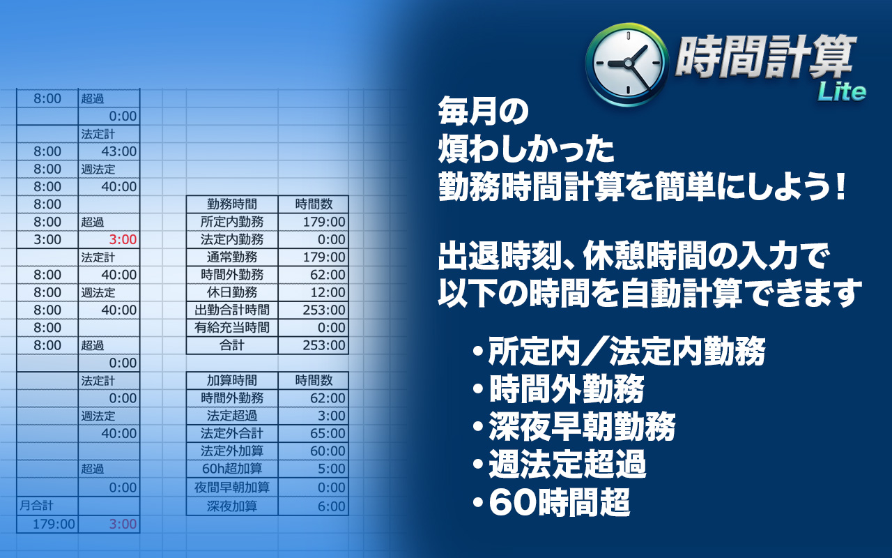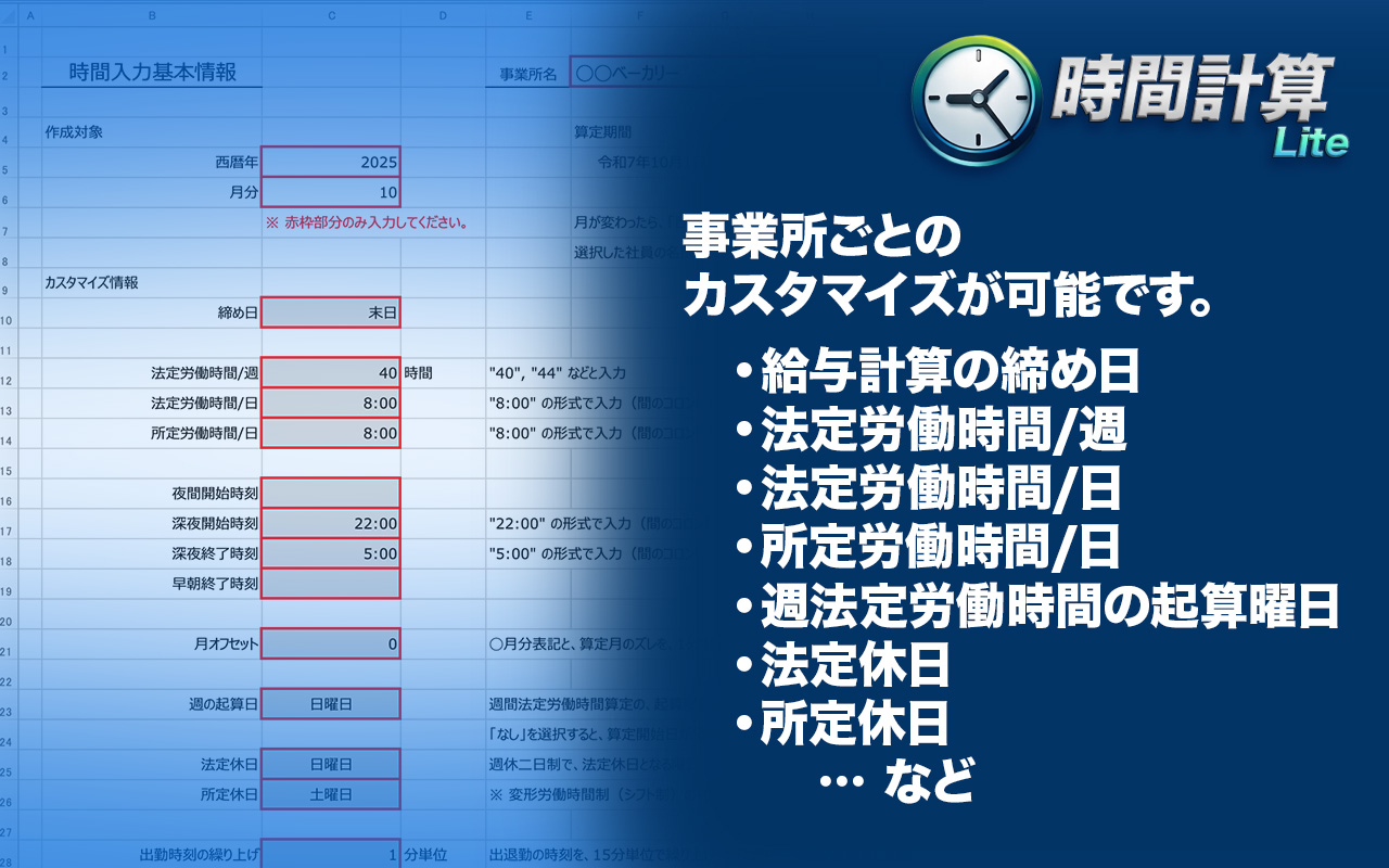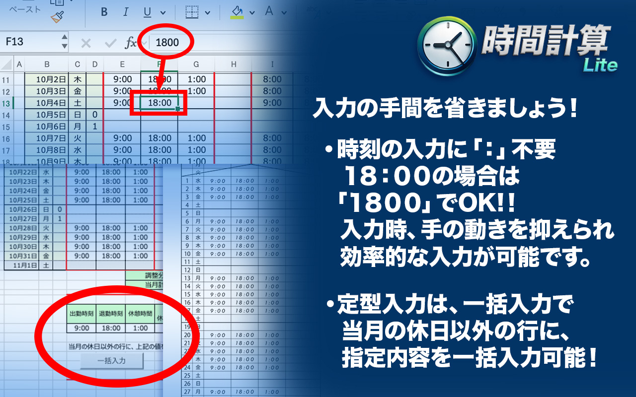 ・当製品は、1ヶ月分の勤怠情報から、給与計算に必要な「勤務時間」「残業時間」「深夜時間」などの「時間」を自動計算するものです。